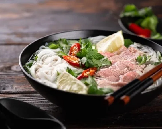 SoupAromatic beef broth with rice noodles, herbs, and tender beef slices.